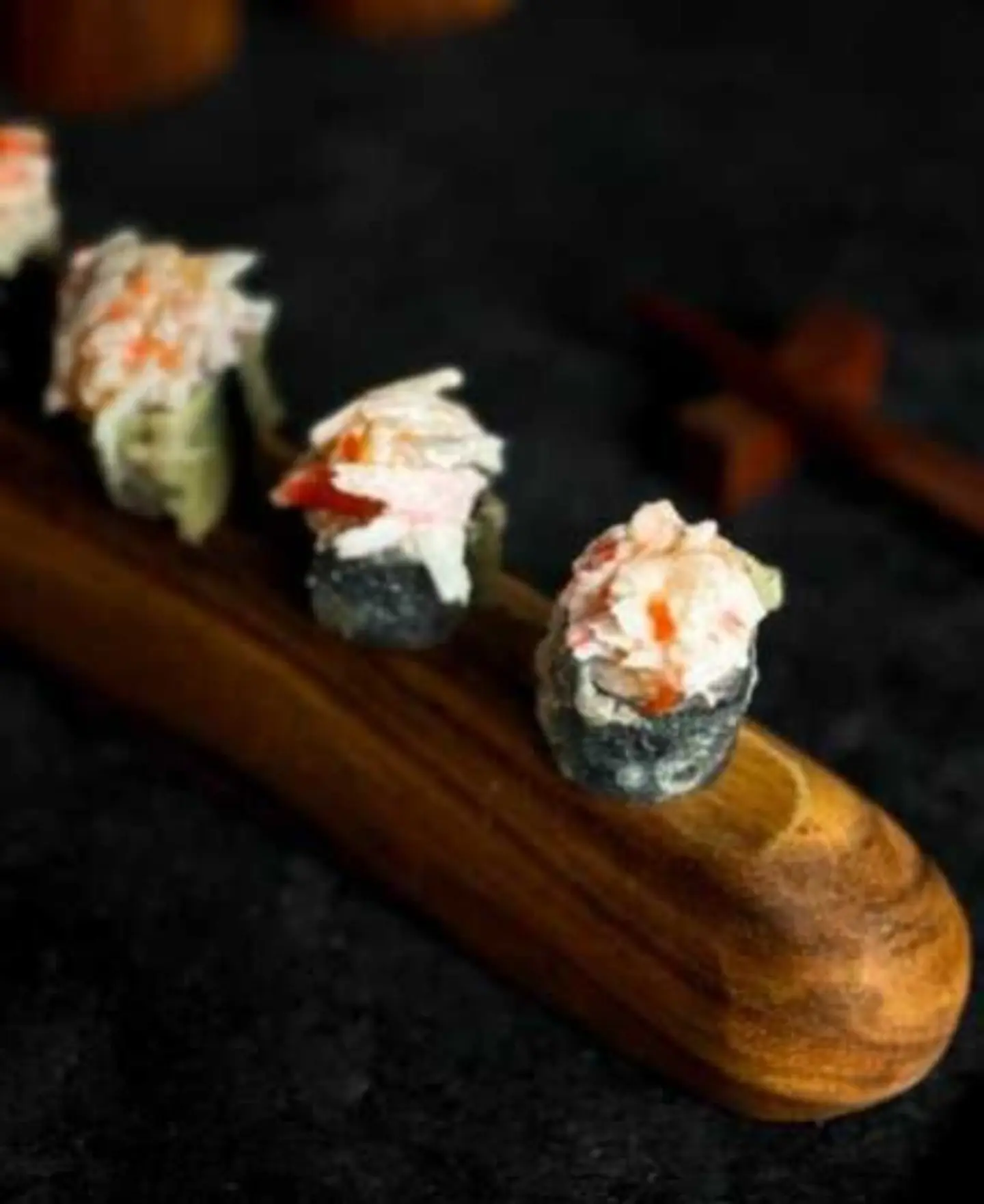 قطع ماكي محشوة بالسلطعون ومزين بشرائح السلطعون من الخارج ونكهة من الواسابي الخفيف