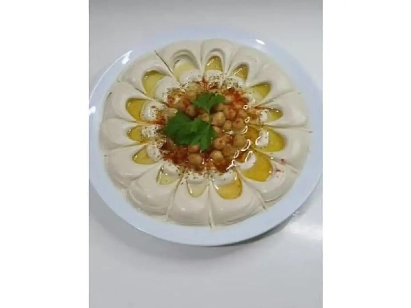 صحن حمص مهروس بطحينة وزيت زيتون، يُقدم كمقبلات.