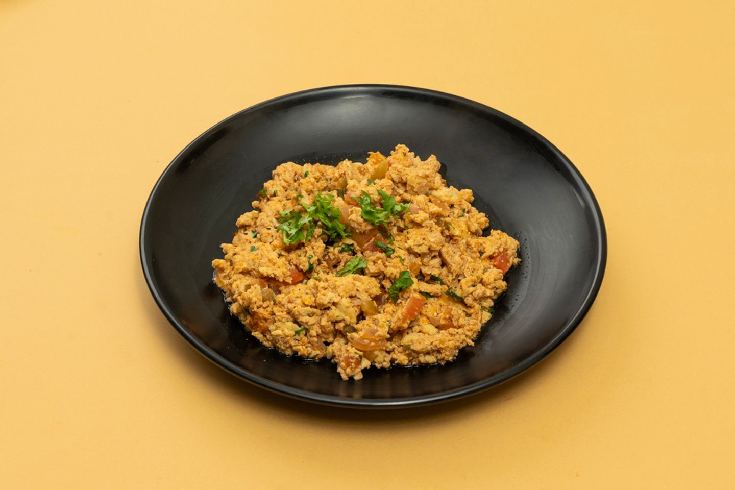 بيض مخفوق مع خضروات مشكّلة وصوص طماطم