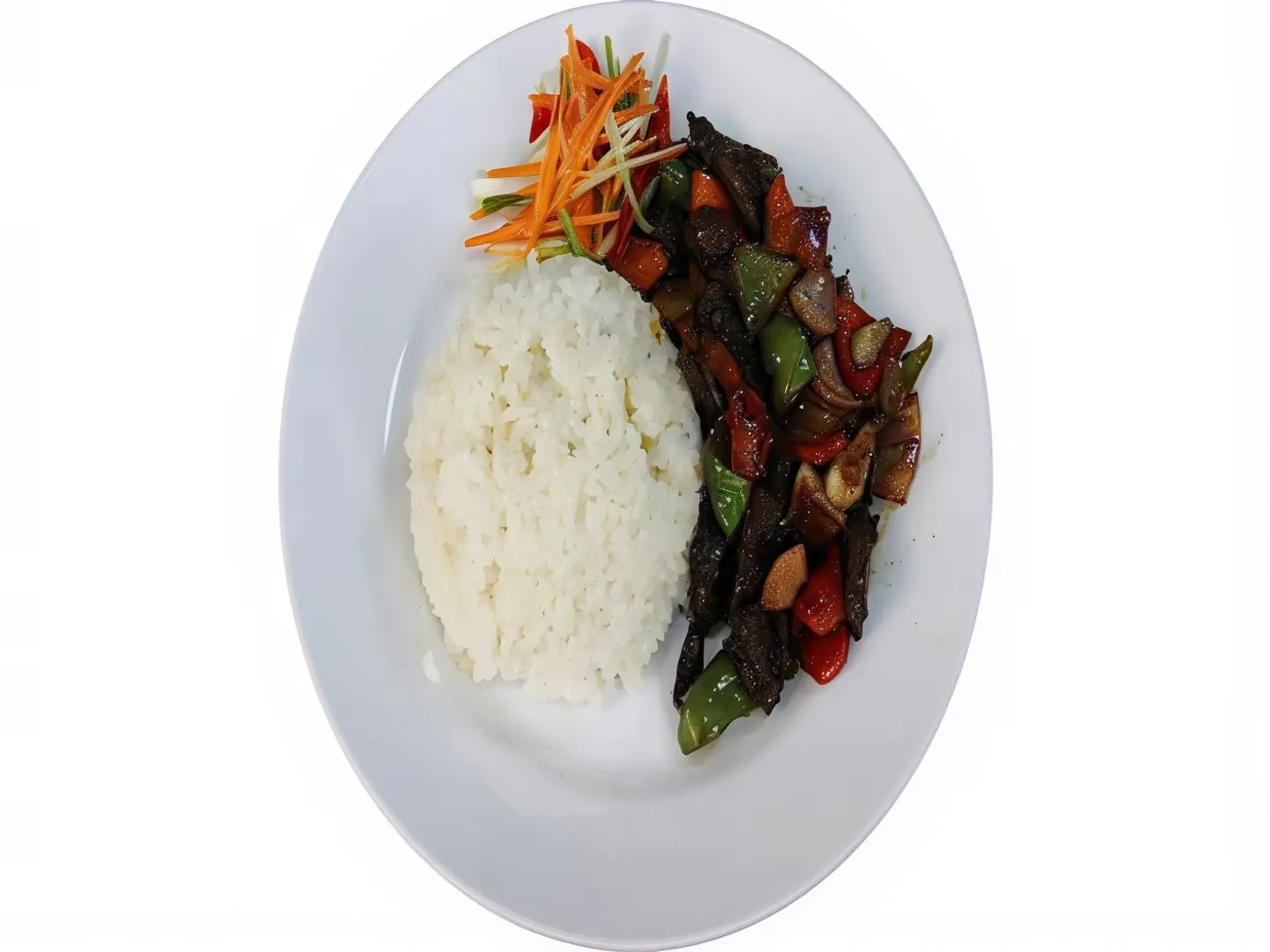 لحم ترياكي يقدم مع الارز والخضروات الطازجة