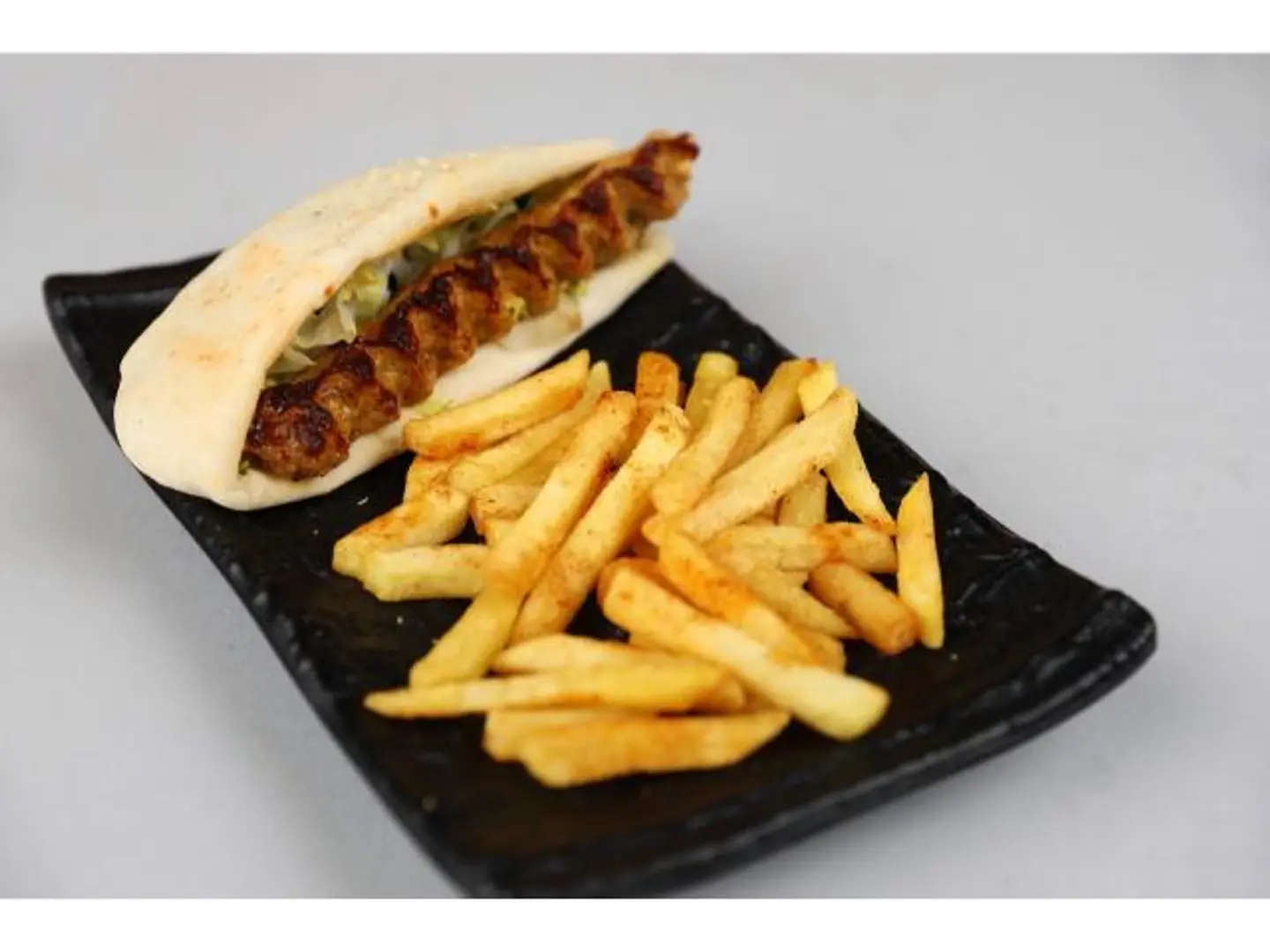ساندوتش لذيذ يحتوي على كباب لحم مشوي طري، يتم تحضيره بتوابل متنوعة