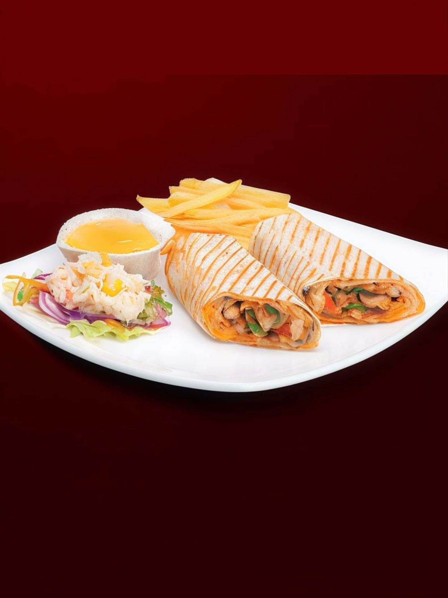 Tender pieces of marinated chicken roasted and stuffed in bread served with potatoes and delicious sauces
