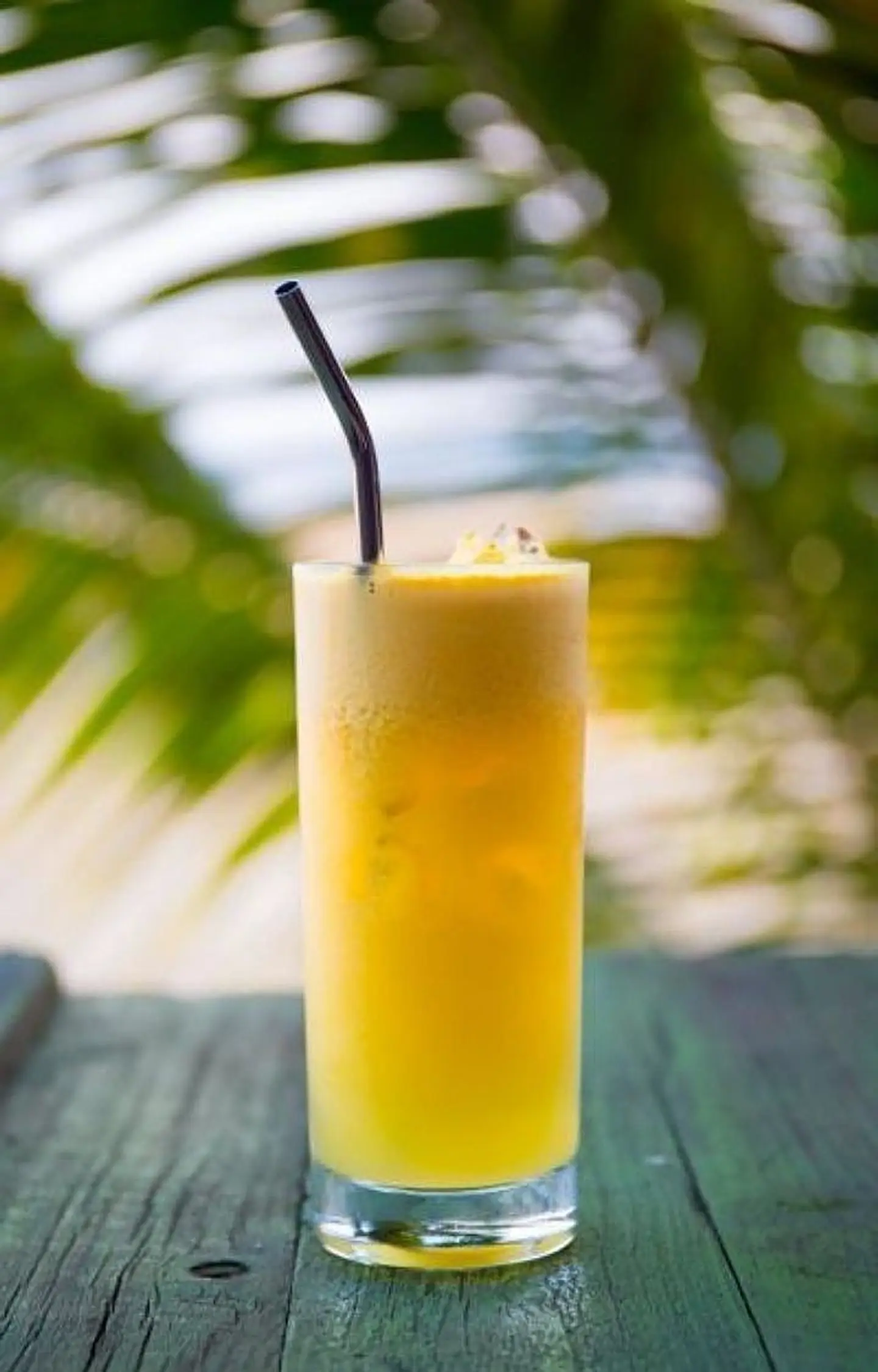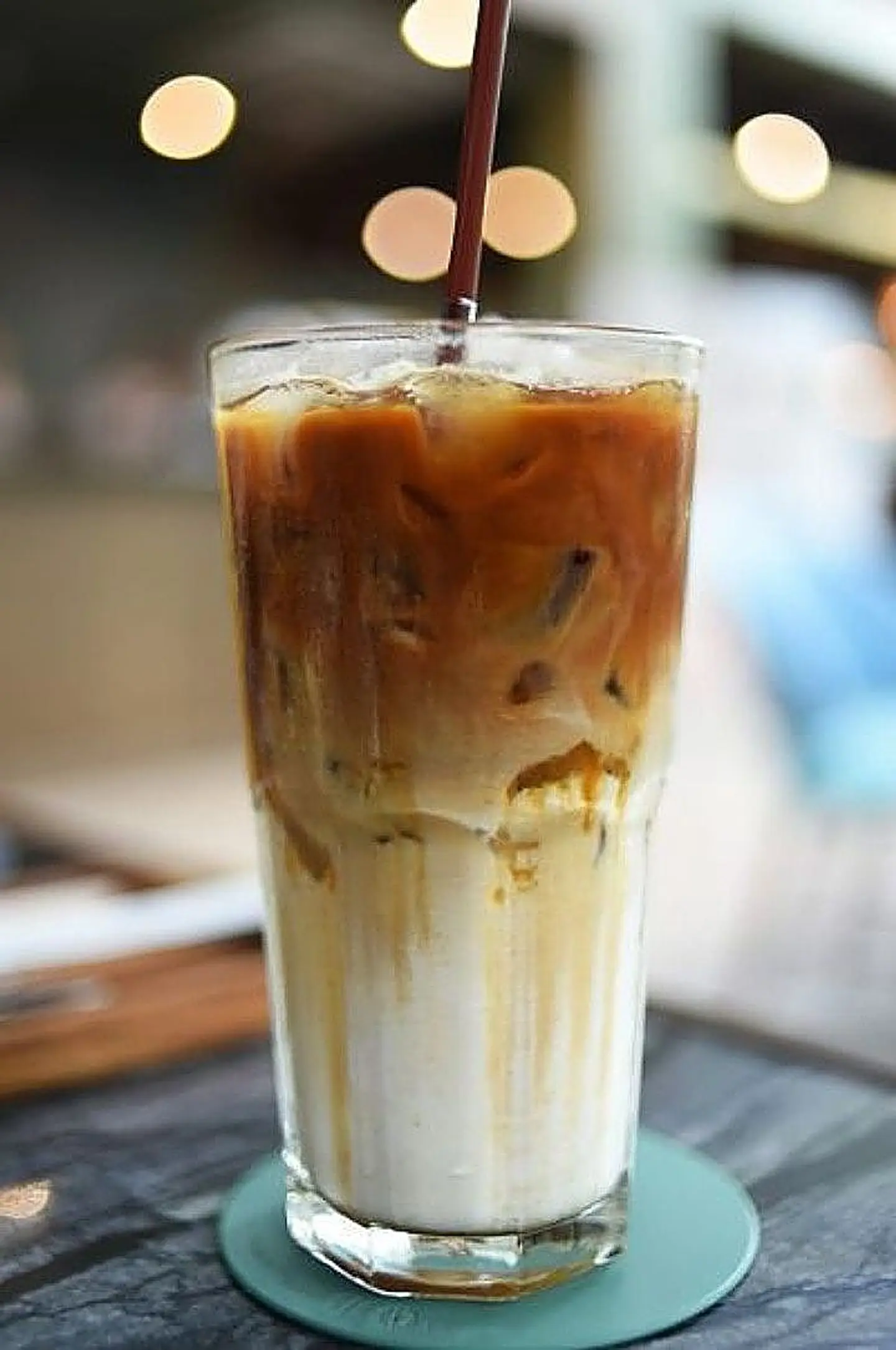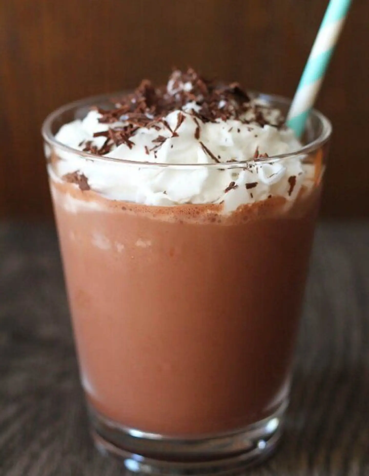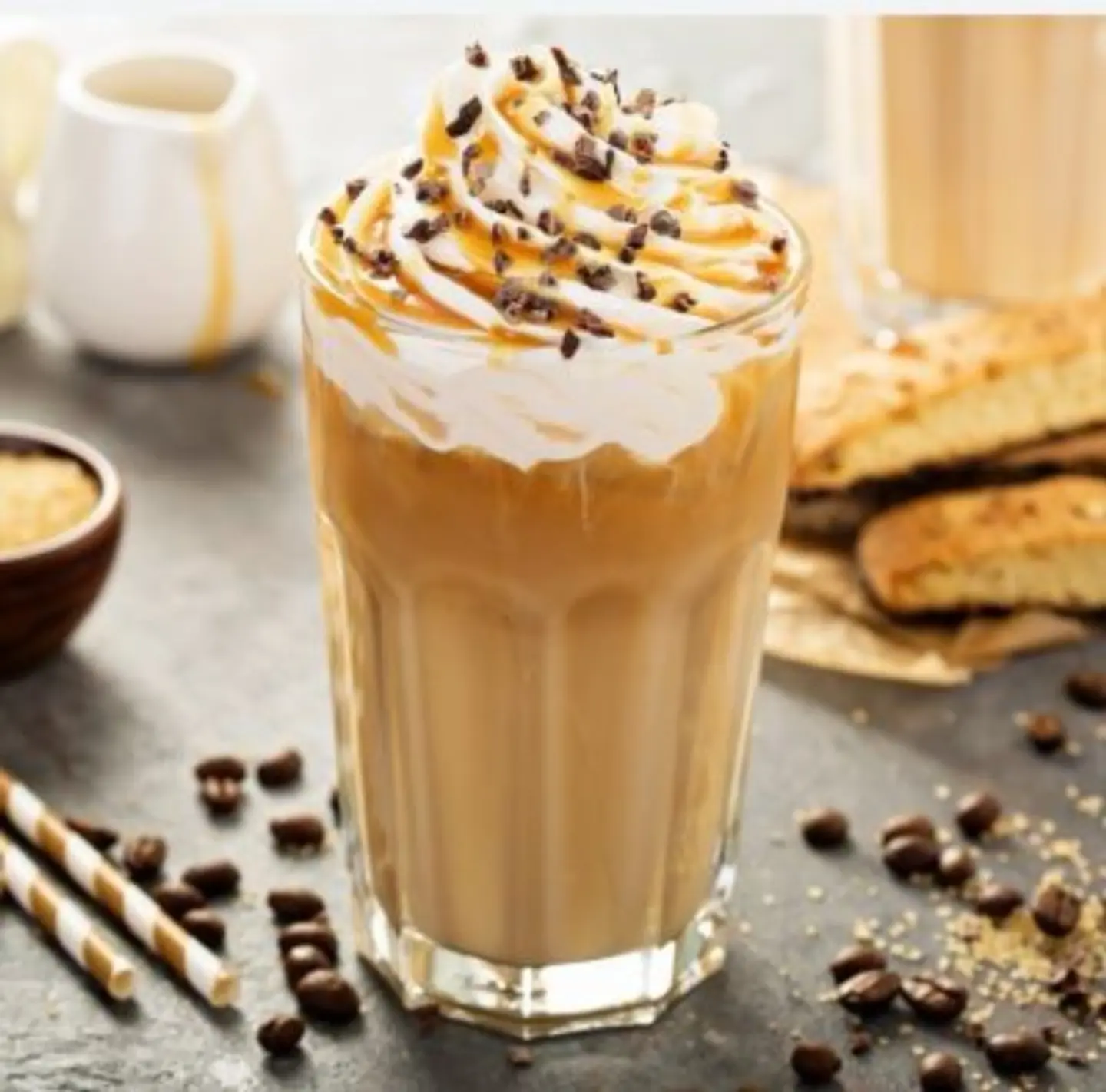 A frozen drink rich in chocolate and caramel flavor with a touch of peanuts.